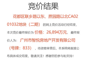 6月16日,花都区、增城区的各一宗住宅用地成功出让,总建设用地面积87375.07平方米,总规划建筑面积10138平方米,总起始价8.94亿元。最终,2宗地块均被两区的区属国企底价拍下,共收金8.94亿元。